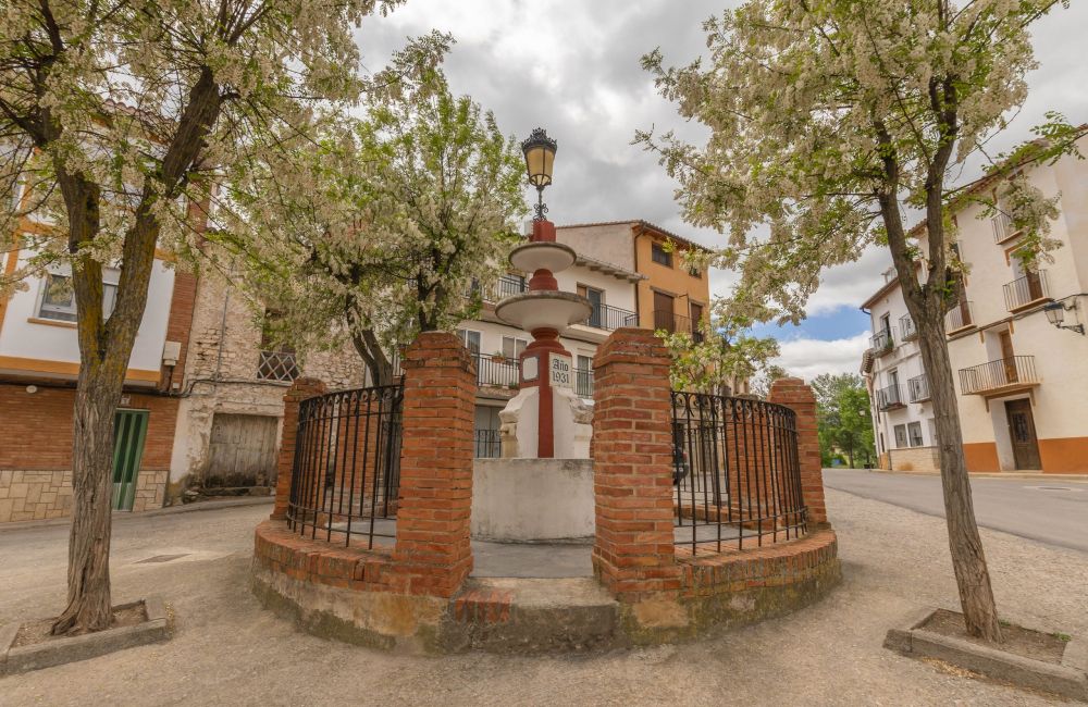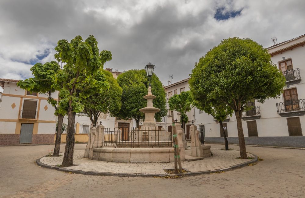 Esta emblemática plaza datada en 1914, refleja el encanto del pueblo. Alberga una fuente centenaria de piedra blanca labrada, con ocho columnas y baranda de hierro que la rodea, con una pica circular de la que se yergue un obelisco central coronado por una farola, rememorando que fue la primera bombilla de alumbrado público que se colocó en la calle.